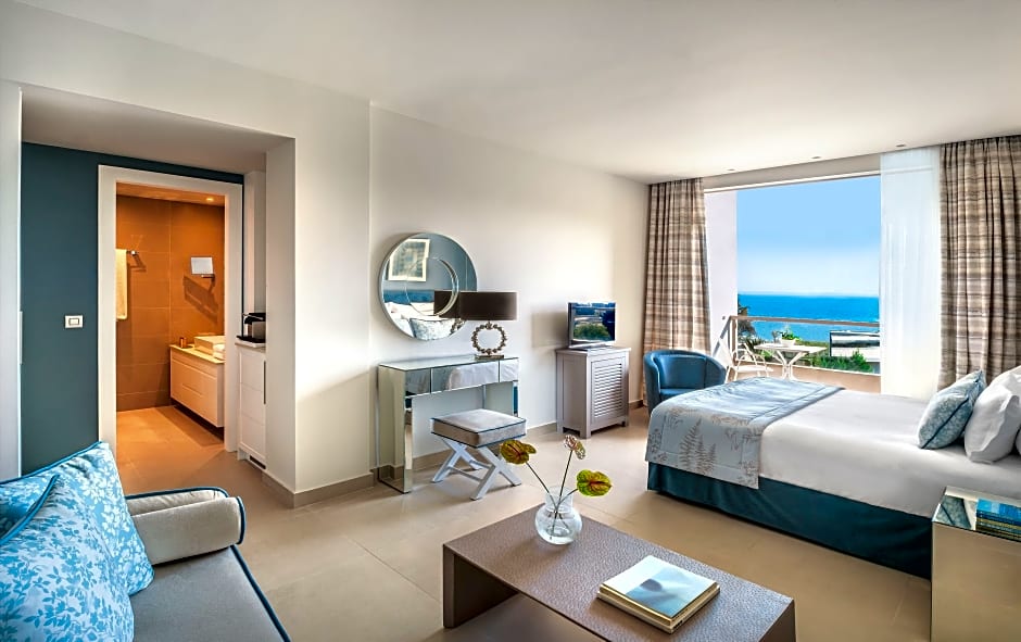Decorated in white and earth tones, this junior suite features elegant decor. This air-conditioned suite features a spacious bathroom and a furnished balcony offering views of the sea.